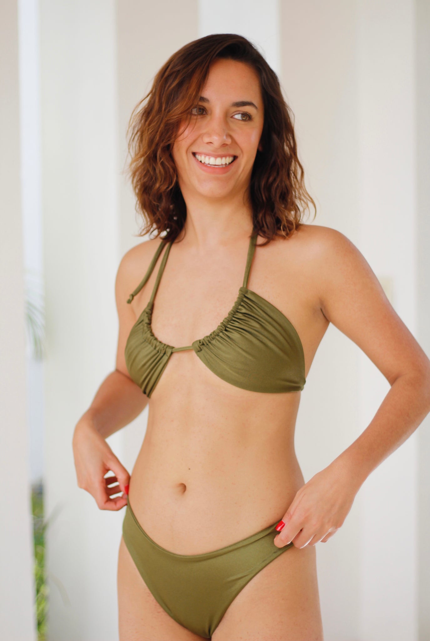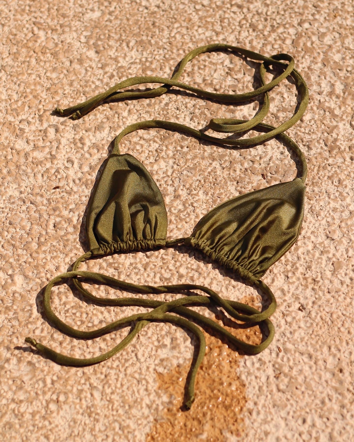 Top de triángulo clásico en verde militar bright. Puedes usarlo de 3 formas distintas.